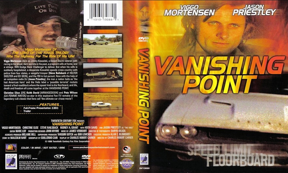 The 1996 (Fox) remake of "Vanishing Point" is a little more politically correct. As it was going to be on prime time TV in the late 90's, you couldn't really have some hippy high on uppers going out for a joy ride without offending too many people. Back in the 70's, it was normal. The car is of course a white 1970 Dodge Challenger R/T but this time with a Hemi under the hood. The story line this time is about Kowalski (played by Viggo Mortensen) who is still a car delivery driver but while out on his delivery, calls to check in on his pregnant wife who is having serious complications. He has to get to her ASAP. While speeding to see her, he's pulled over by the cops who find it's not his car (being a delivery driver) and they threaten to hold him for 48 hours. Getting back into his car to get his license, Kowalski weighs it all up, and decides to drive off. The chase begins.